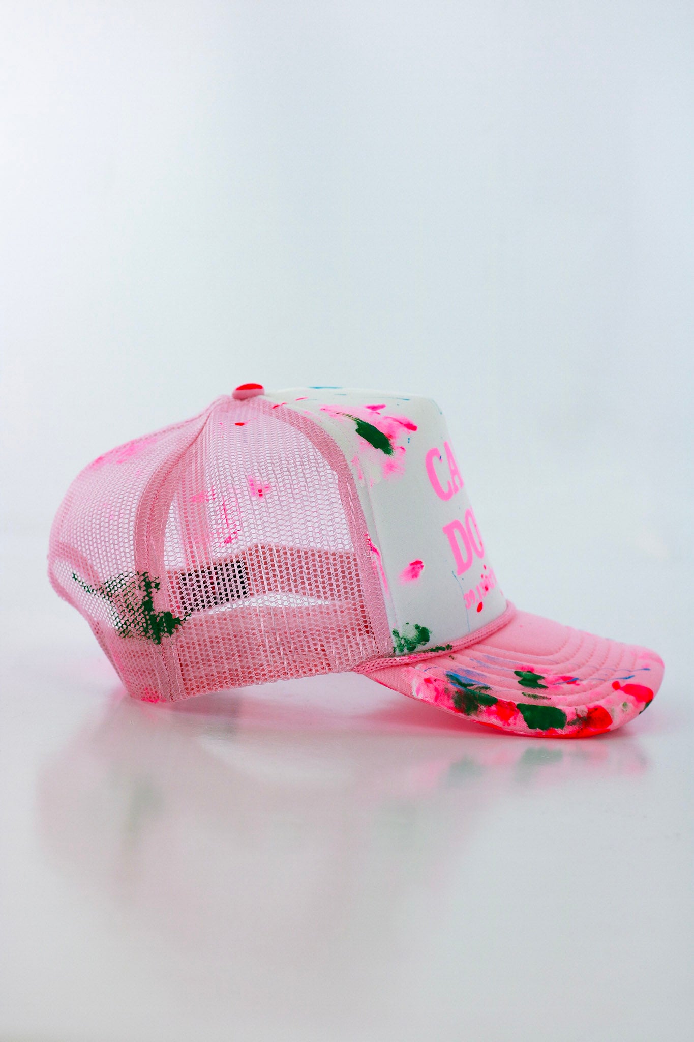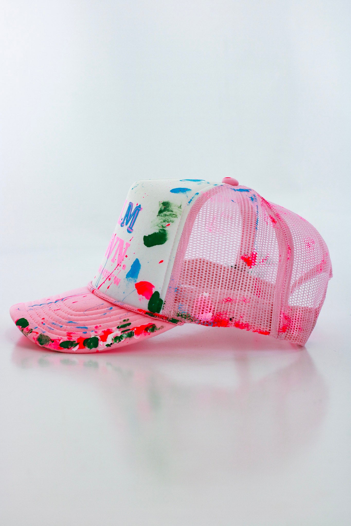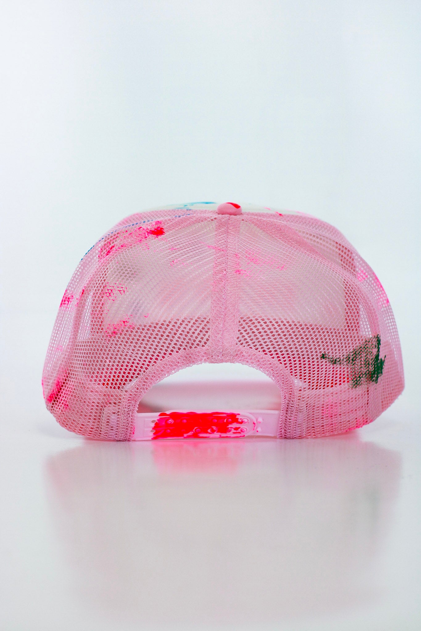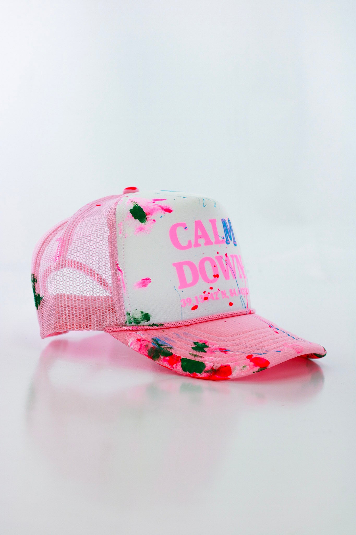 "1 OF 1 2025 DROP." - CALM DOWN HAT: PINK NET, WHITE PANEL, PINK INK, ART.