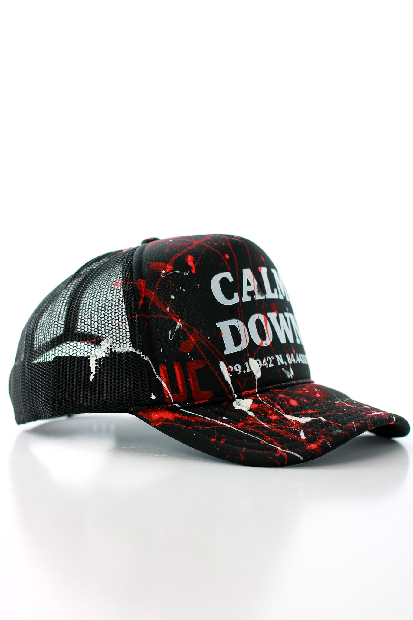 CALM DOWN HAT: 1 OF 1 BLACK NET, BLACK PANEL, WHITE INK