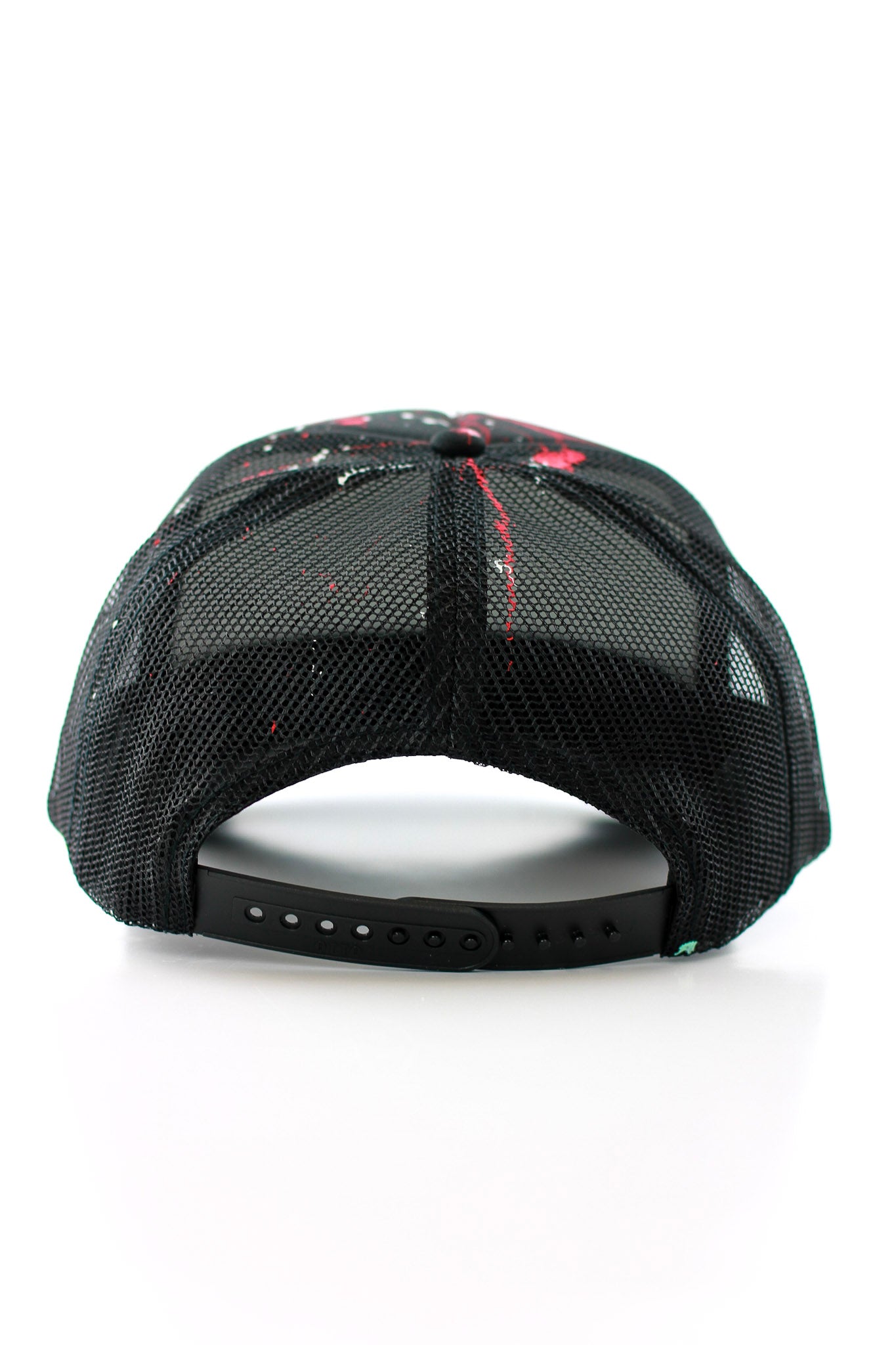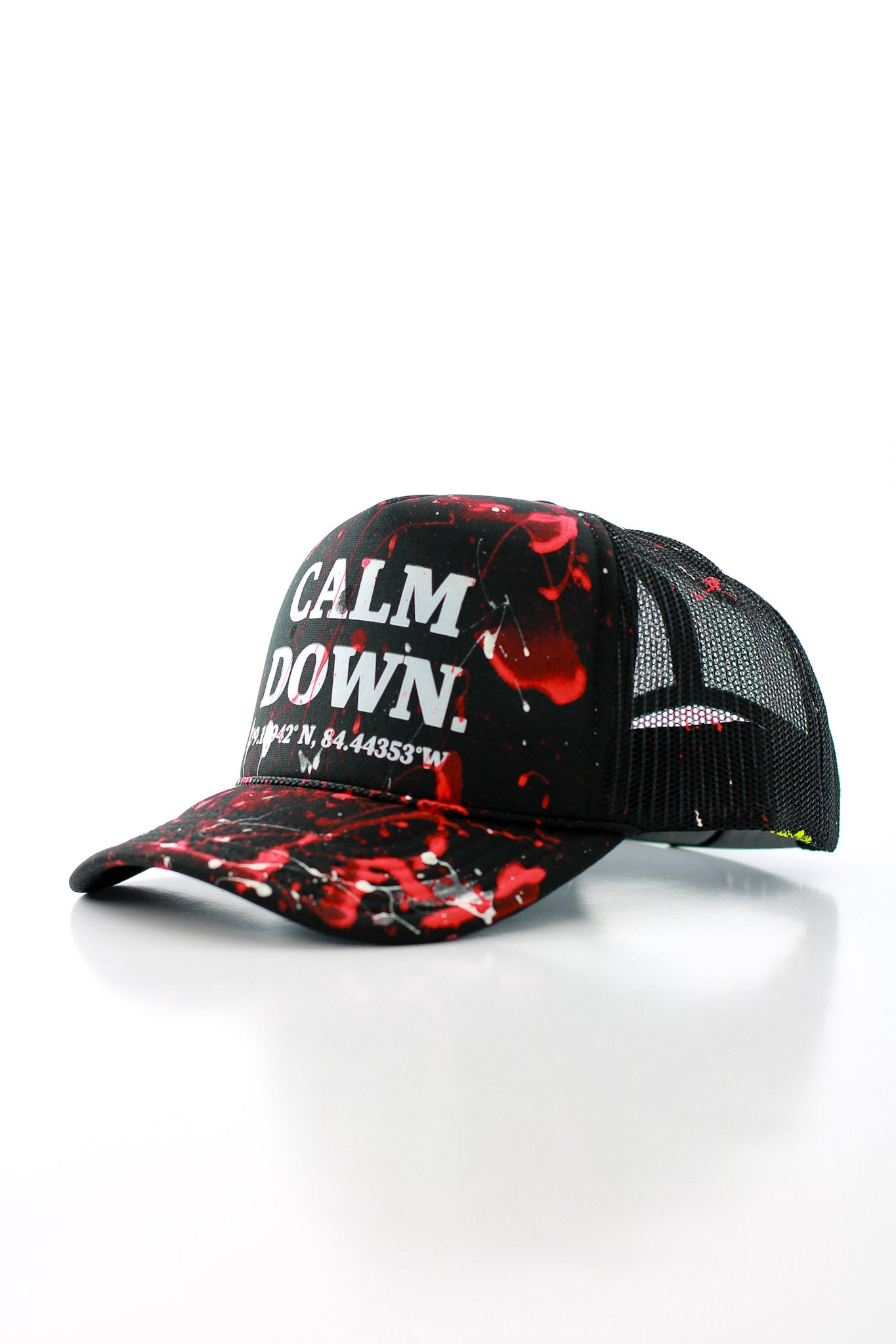 "1 OF 1 2025 DROP." - CALM DOWN HAT: BLACK NET, BLACK PANEL, WHITE INK, ART.