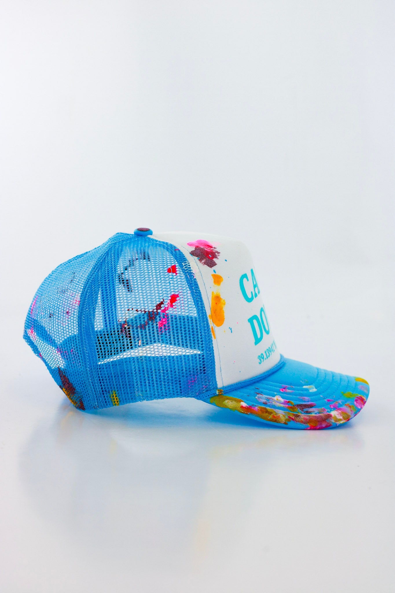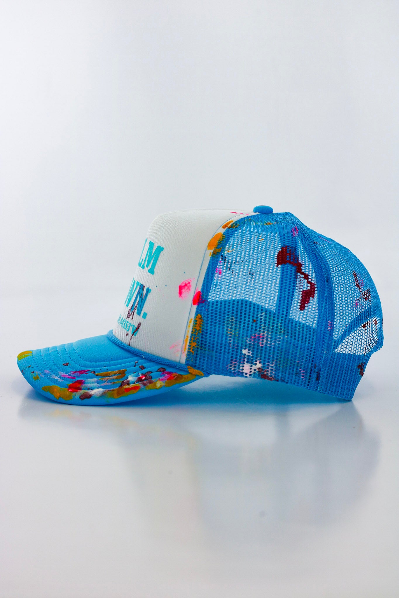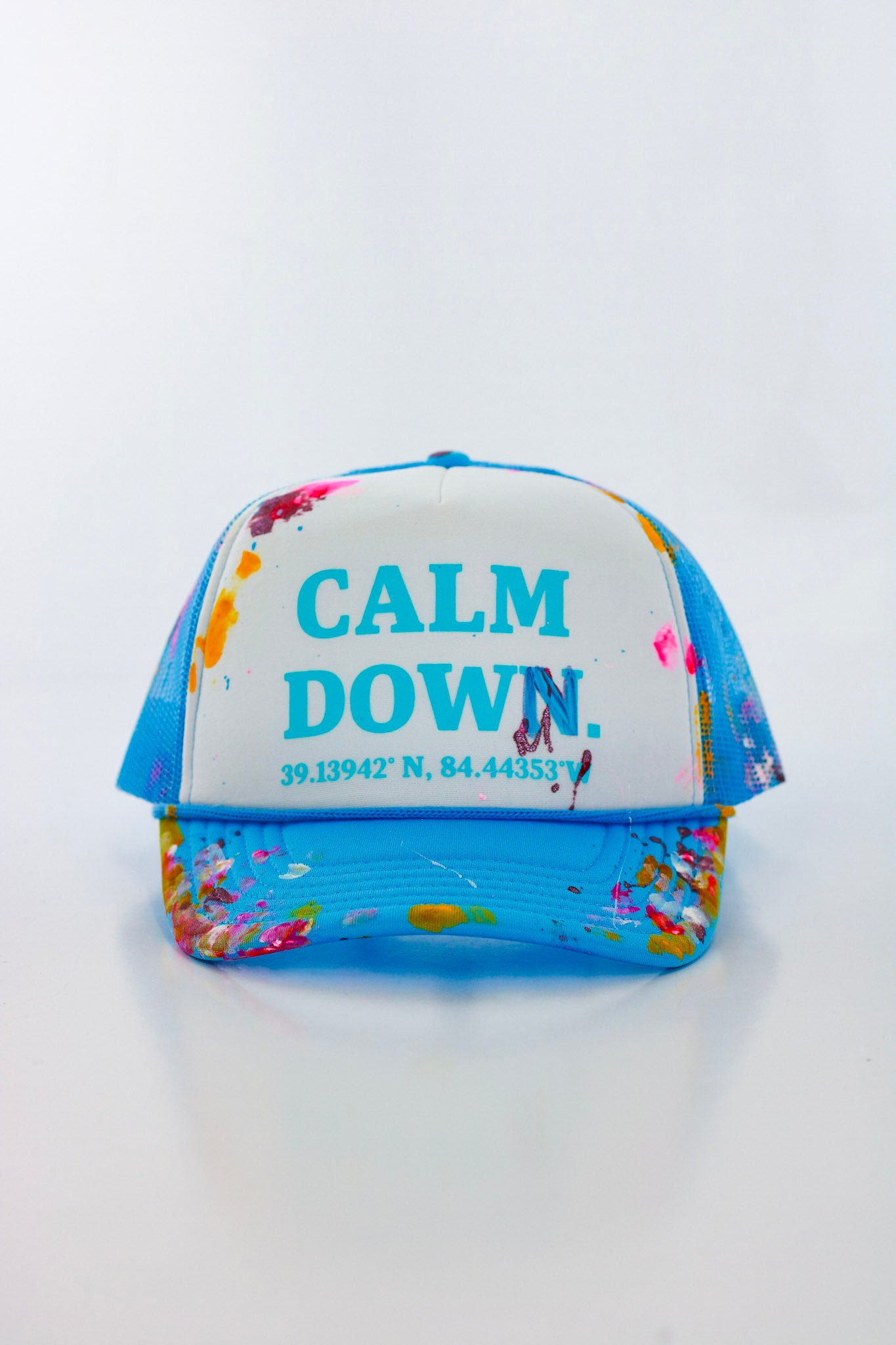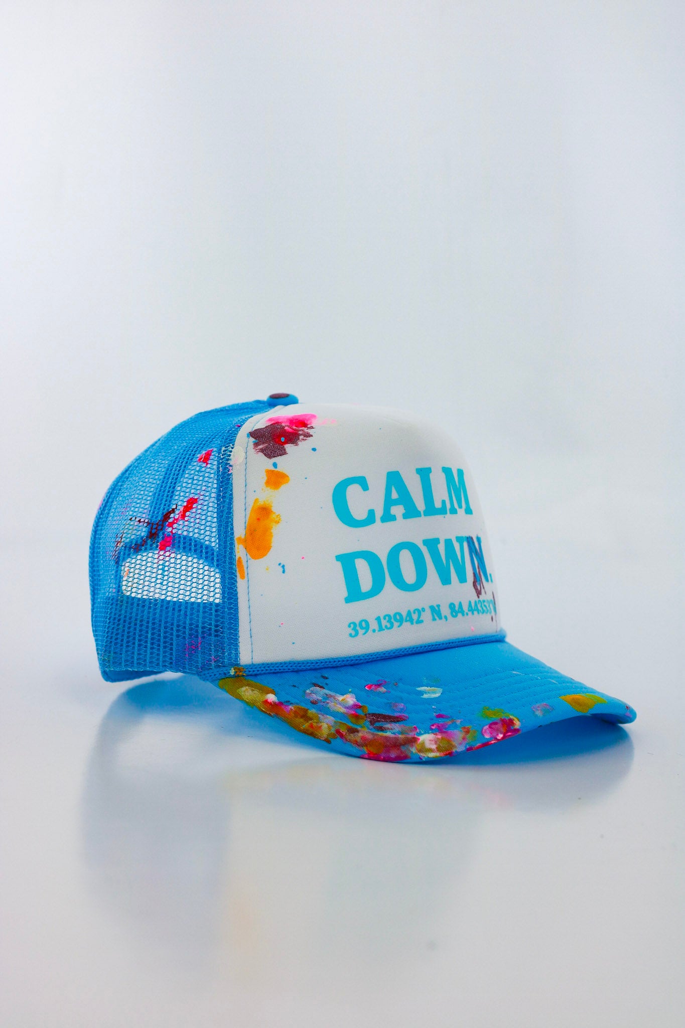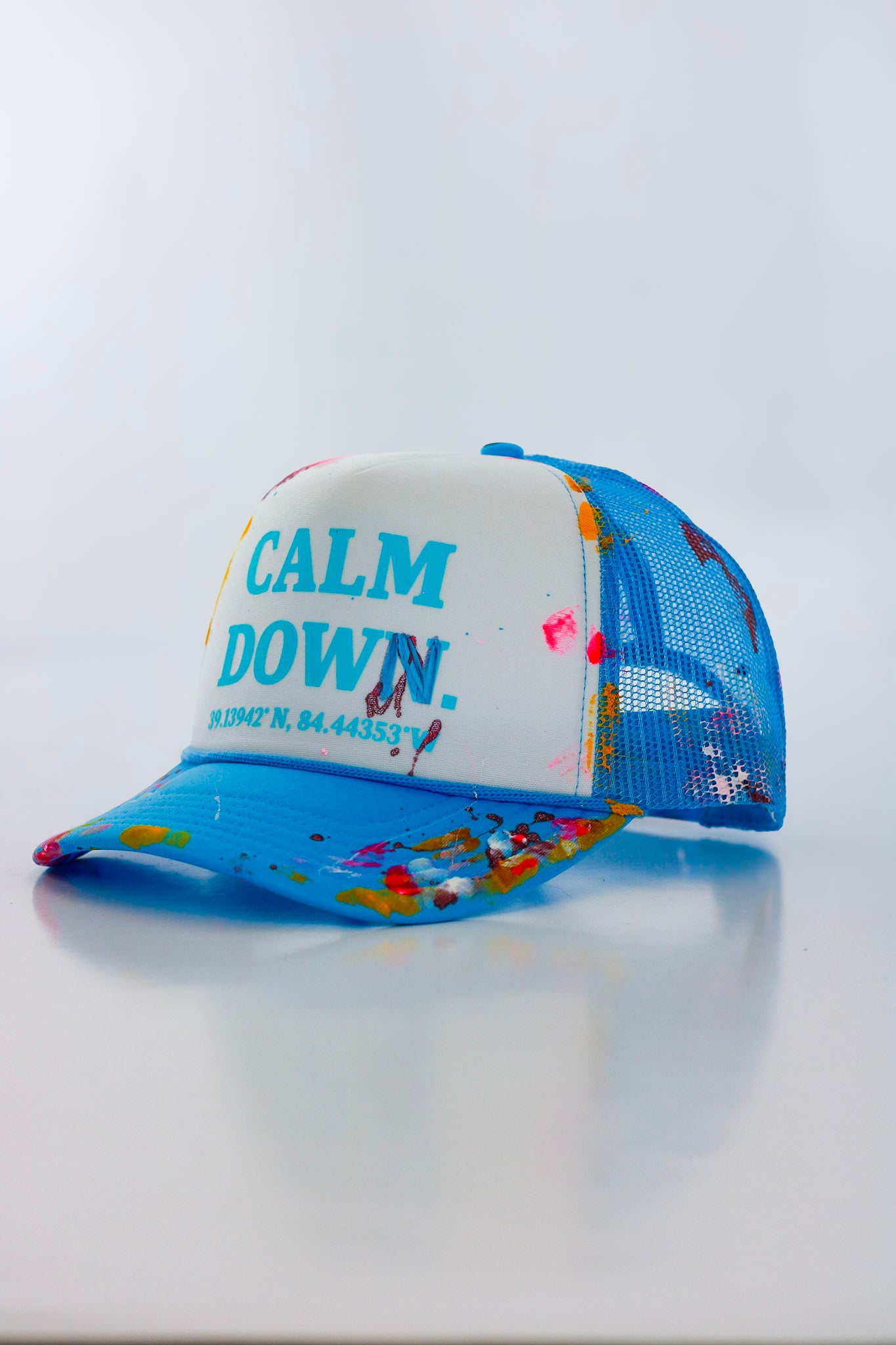 "1 OF 1 2025 DROP." - CALM DOWN HAT: BLUE NET, WHITE PANEL, BLUE INK, ART.