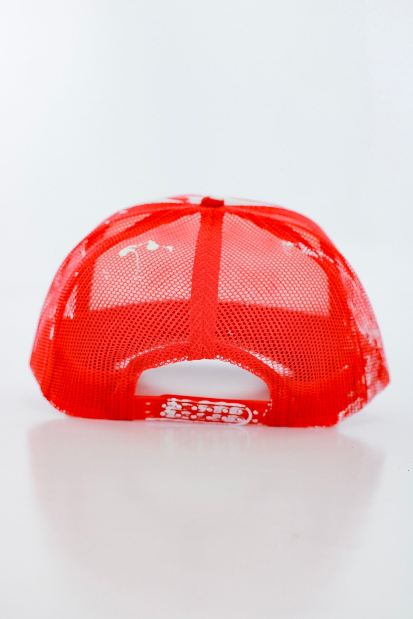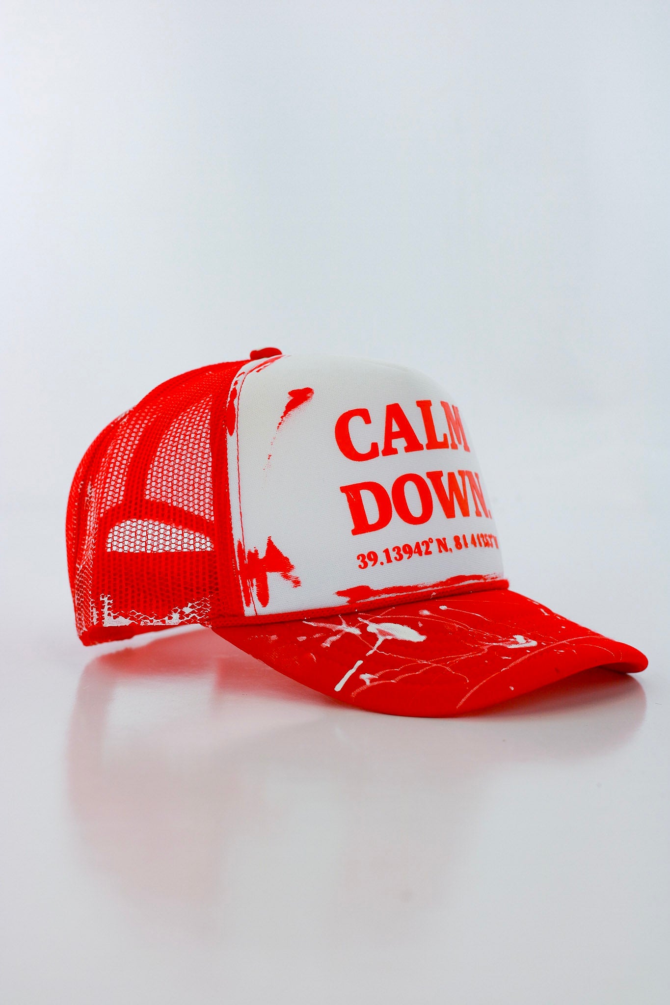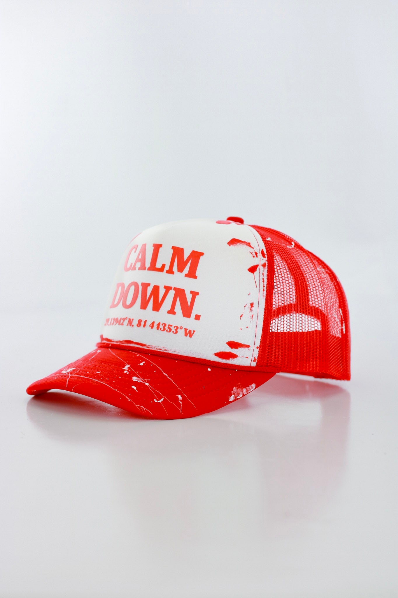 CALM DOWN HAT: 1 OF 1 RED NET, WHITE PANEL, RED INK