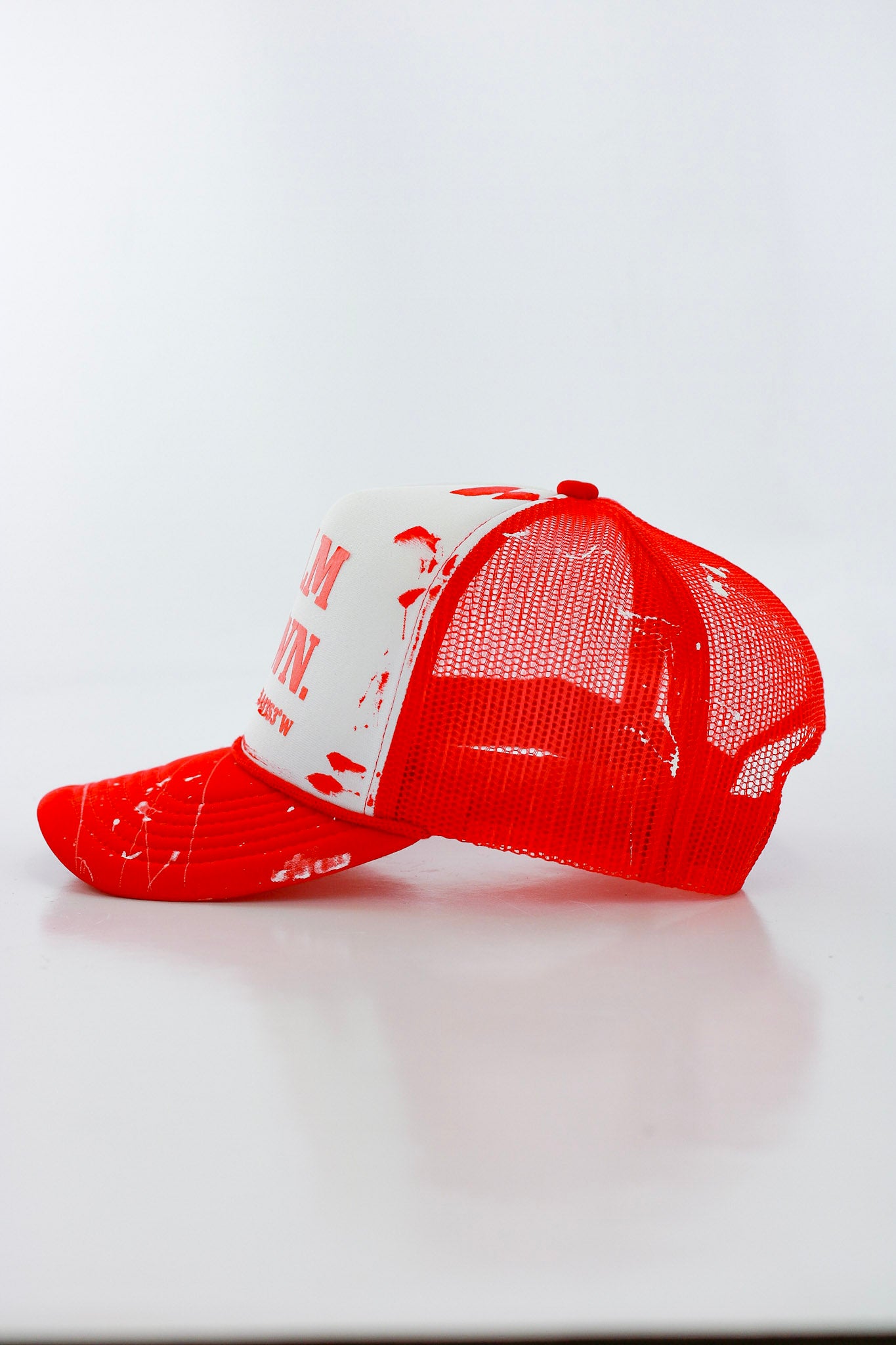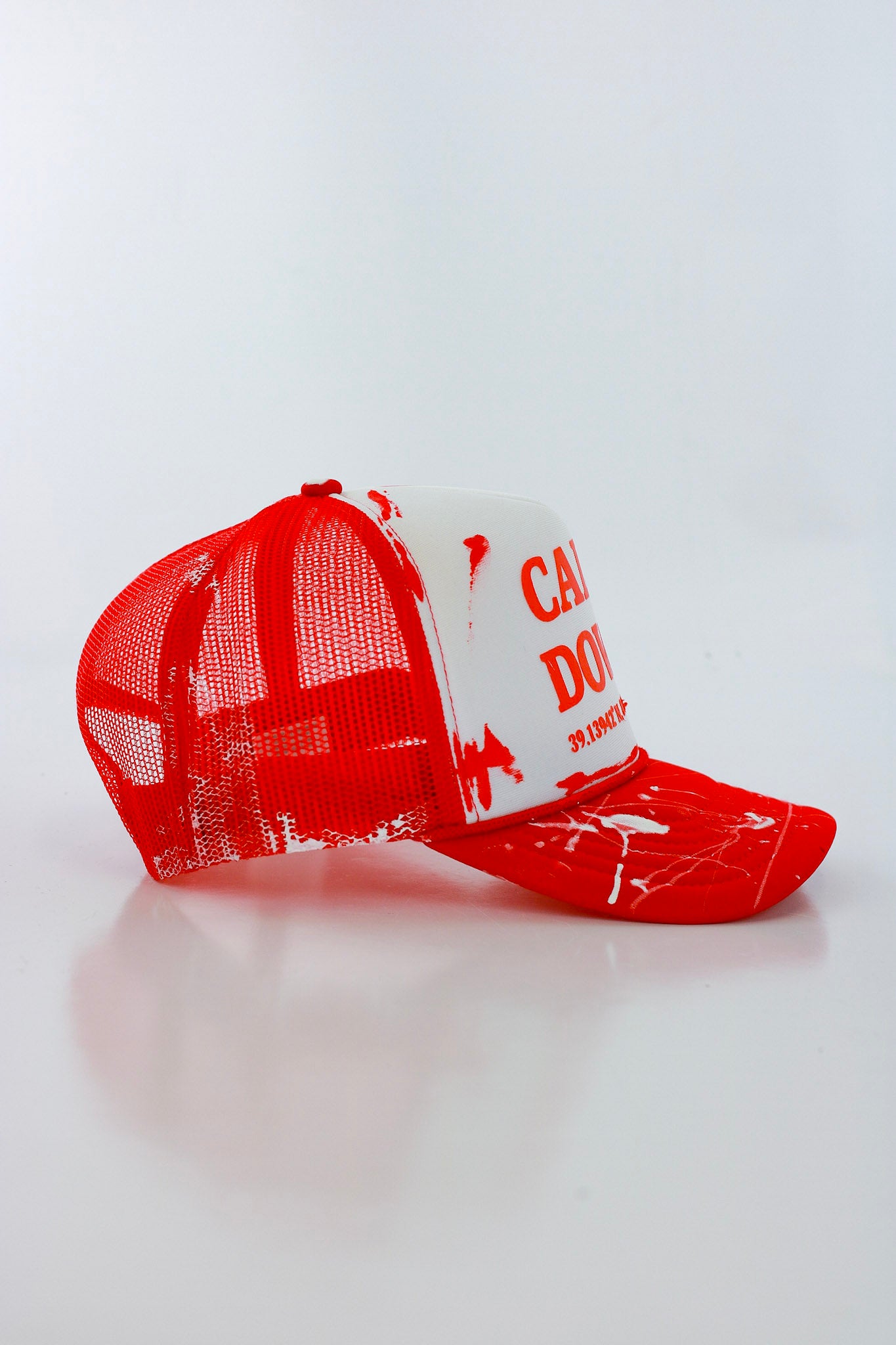 "1 OF 1 2025 DROP." - CALM DOWN HAT: RED NET, WHITE PANEL, RED INK, ART.
