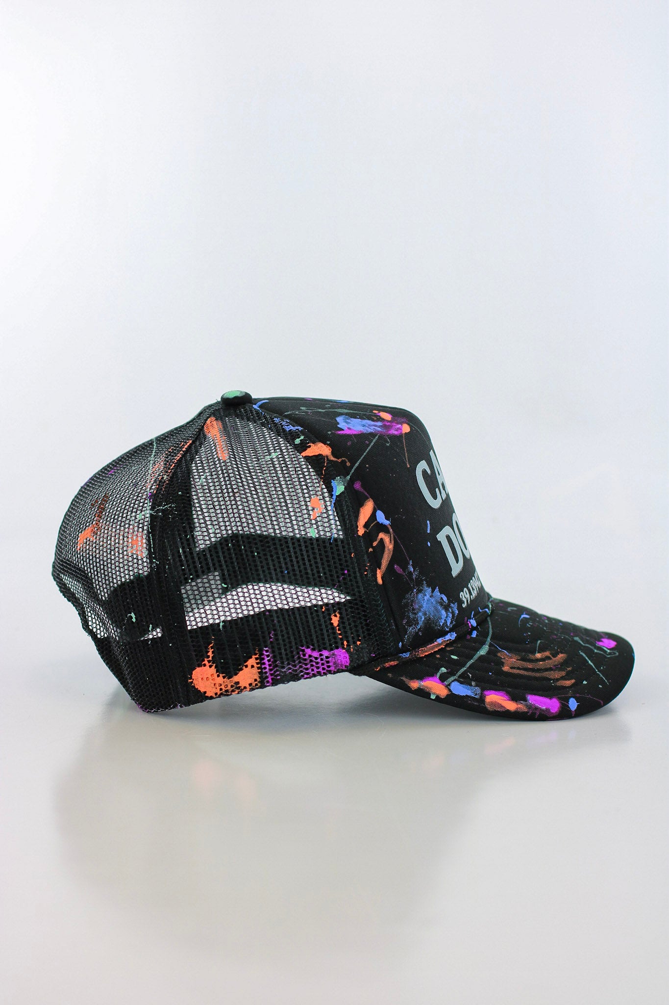 "1 OF 1 2025 DROP." - CALM DOWN HAT: BLACK NET, BLACK PANEL, WHITE INK, ART.