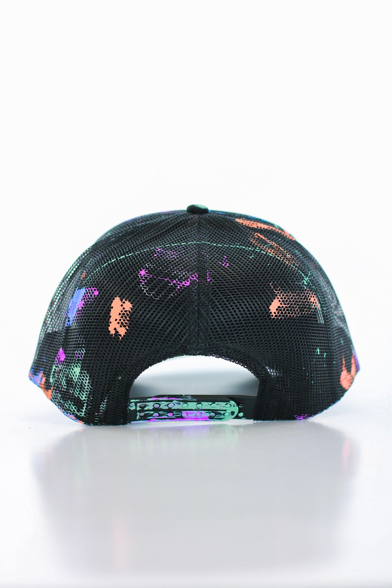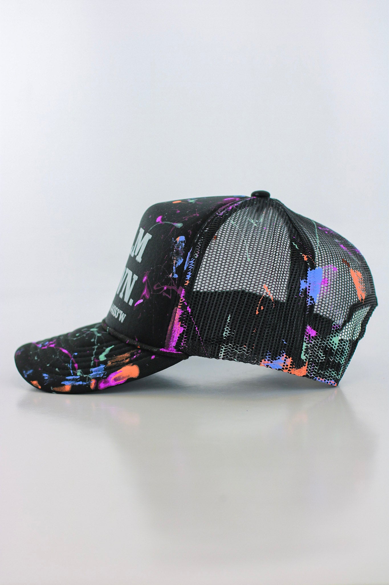 CALM DOWN HAT: 1 OF 1 BLACK NET, BLACK PANEL, WHITE INK